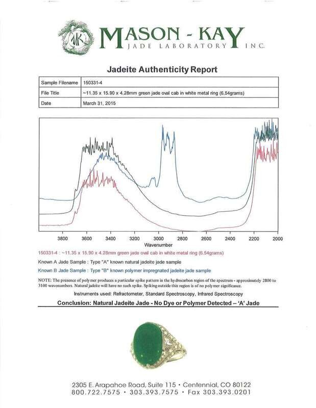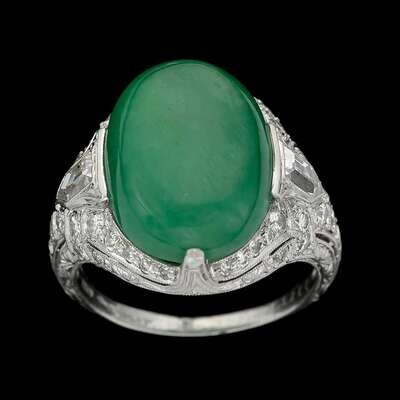 centering an oval cabochon jadeite measuring: 15.90 x 11.35 x 4.27mm; in a detailed single, full and bullet-cut diamond-set mounting; total diamond weight approximately: 1.00 carat; and numbered 20733.