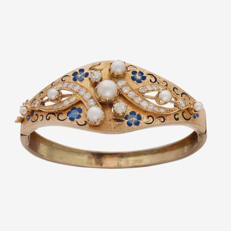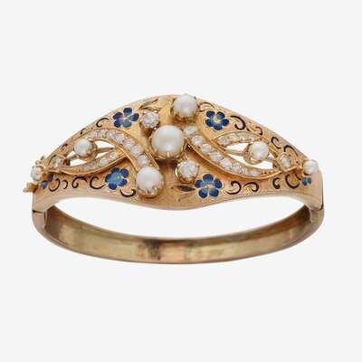 A diamond, cultured pearl, enamel and fourteen karat rose gold bangle bracelet