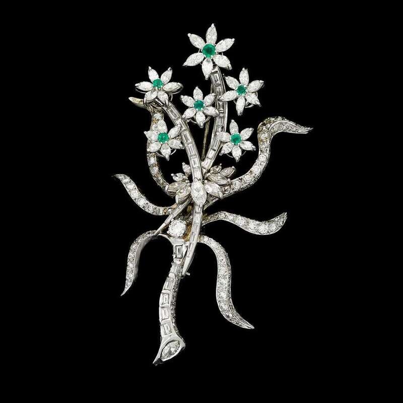 foliate motif spray with marquise-cut diamond flowers centering round-cut emeralds and set throughout with baguette, marquise, full, single and round brilliant-cut diamonds; total diamond weight approximately: 9.50 carats.