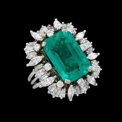 centering a step-cut emerald weighing approximately: 8.00 carats; in a full, tapered baguette and marquise-cut diamond surround; total diamond weight approximately: 2.45 carats.