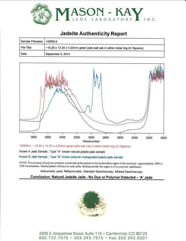 centering an oval cabochon jadeite measuring: 13.34 x 10.25 x 4.23mm; in a marquise and full-cut diamond surround; total diamond weight approximately: 1.30 carats.