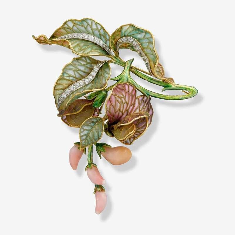 foliate motif with translucent plique-à-jour leaves and petals accented with single and old European-cut diamonds, terminating in an articulated cluster of conch pearl buds; total diamond weight approximately: 0.70 carat; signed Marcus & Co..