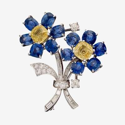 A yellow sapphire, sapphire, diamond and platinum brooch