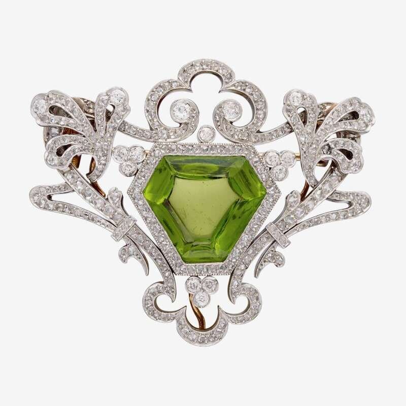 A Belle Époque peridot, diamond and platinum-topped eighteen karat gold pendant brooch