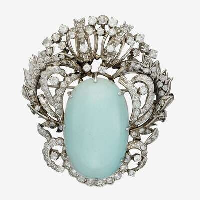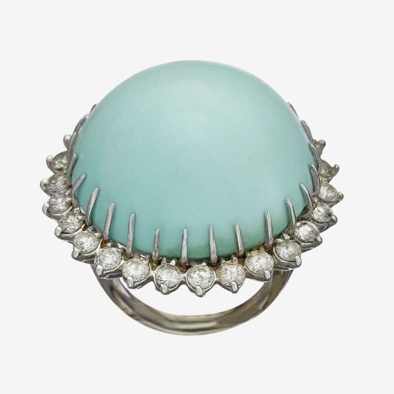 including fourteen and eighteen karat white gold; consisting of a ring centering a large round cabochon turquoise in a round brilliant-cut diamond surround and a pendant brooch centering an oval cabochon turquoise accented by single and full-cut diamonds; total diamond weight approximately: 7.75 carats.