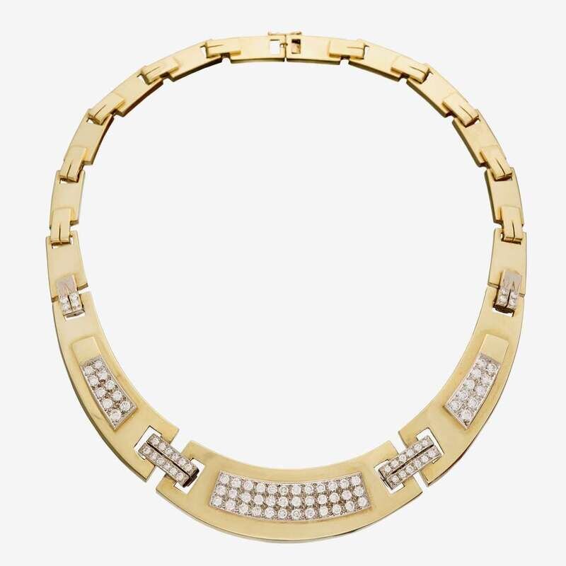 graduated polished gold links centering a pavé-set diamond plaque with pavé-set diamond links and accents; total diamond weight approximately: 5.20 carats.