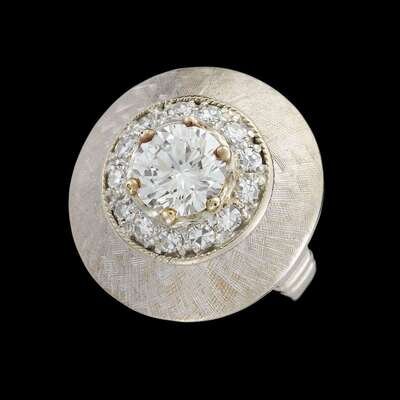 centering a round brilliant-cut diamond weighing approximately: 2.15 carats; in a single-cut diamond and florentine finished gold surround; total remaining diamond weight approximately: 0.50 carat.