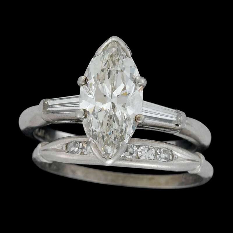 centering a marquise-cut diamond weighing approximately: 1.90 carats; flanked by tapered baguette-cut diamonds and accompanied by band set with single-cut diamonds.