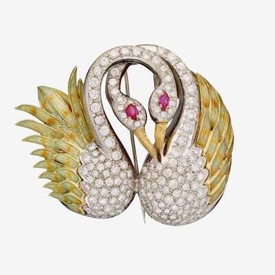 designed as two swans with pavé-set diamond bodies, gold and green enamel wings and marquise-cut ruby eyes; total diamond weight approximately: 7.40 carats; singed Moba with maker's mark.