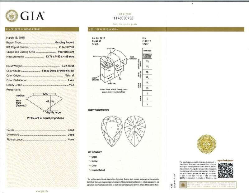 suspending a pear-shaped fancy deep brown-yellow diamond weighing: 3.72 carats; accented by full-cut diamonds.