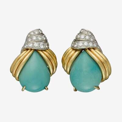 A pair of turquoise, diamond, eighteen karat gold and platinum ear-clips, David Webb