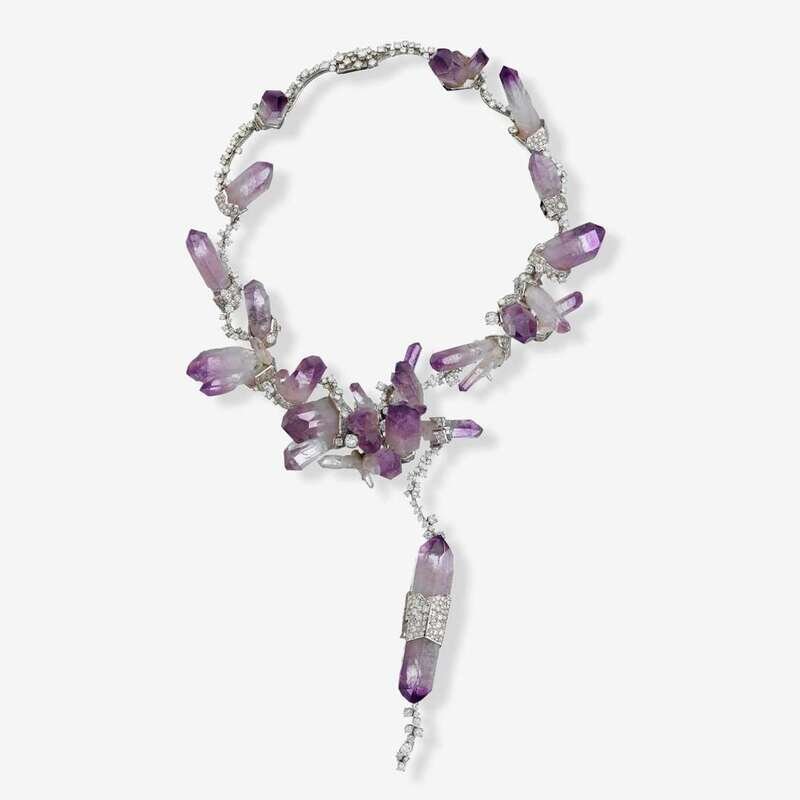 abstract motif with rough amethyst crystals and set throughout with single and round brilliant-cut diamonds; total diamond weight approximately: 15.00 carats; French assay marks and maker's mark for Jean Vendome; accompanied by original fitted case.