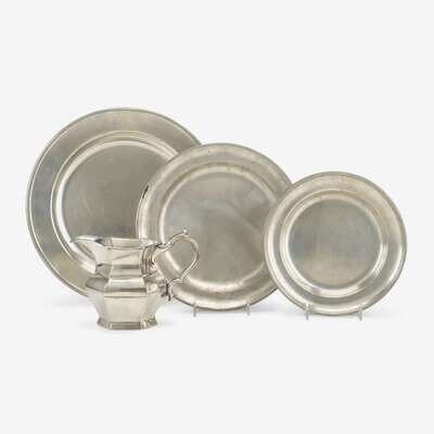 The first charger inscribed, "Pewter Plate made a century ago"; the second, larger, inscribed, "Pewter Plate made eighty years ago" and marked to underside; the hexagonal water pitcher marked to underside; together with a silver-plated charger, manufactured and plated by Reed & Barton.
