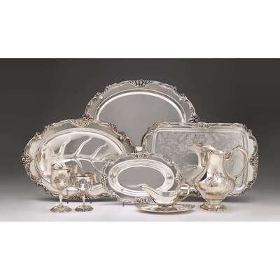 Comprising seven bread trays, three sandwich plates, two oval serving trays, a well-and-tree serving platter, sauce boat, chafing dish, water pitcher and six goblets, each marked to underside.