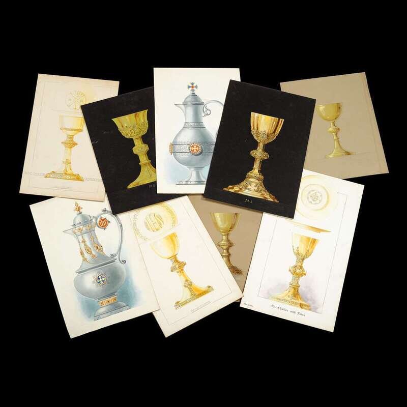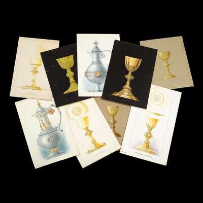 Depicting chalices, patens and flagons, some numbered and titled, each graphite, heightened with gouache, on board, some with ink, unframed.
