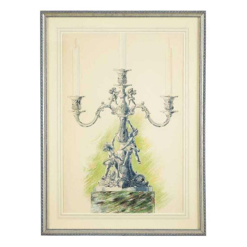 Three depicting tea services in varied patterns; the others depicting three gallon punch bowl, tray & cup; compotes and footed bowls; and candelabrum, respectively; each mixed media on illustration board, one framed.