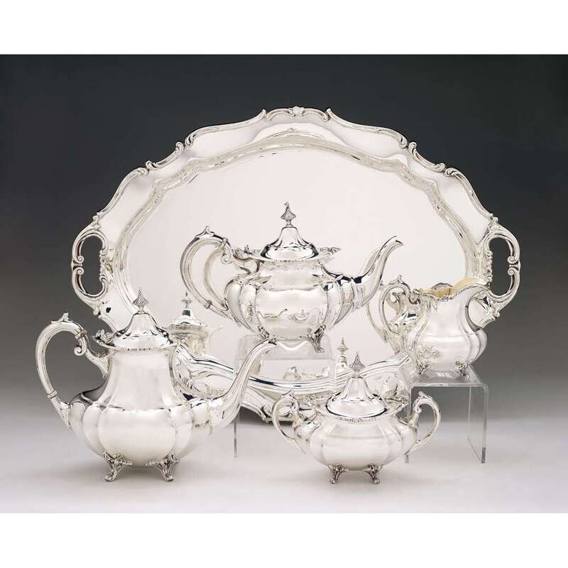 Five piece sterling silver 'Hampton Court' pattern tea and coffee service reed & barton, taunton, ma, circa 1949