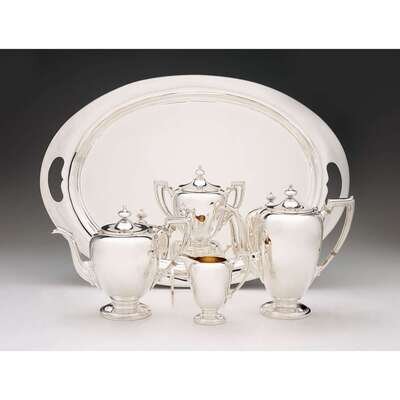 H: 10 in. (coffee pot). L: 24 1/2 in. (tray). Total weight: 175 troy oz.