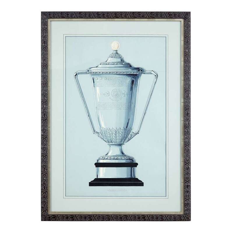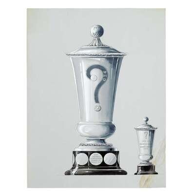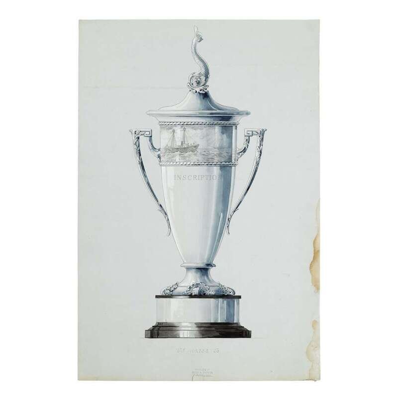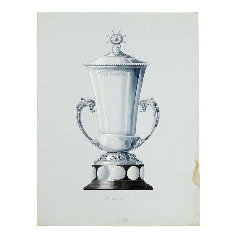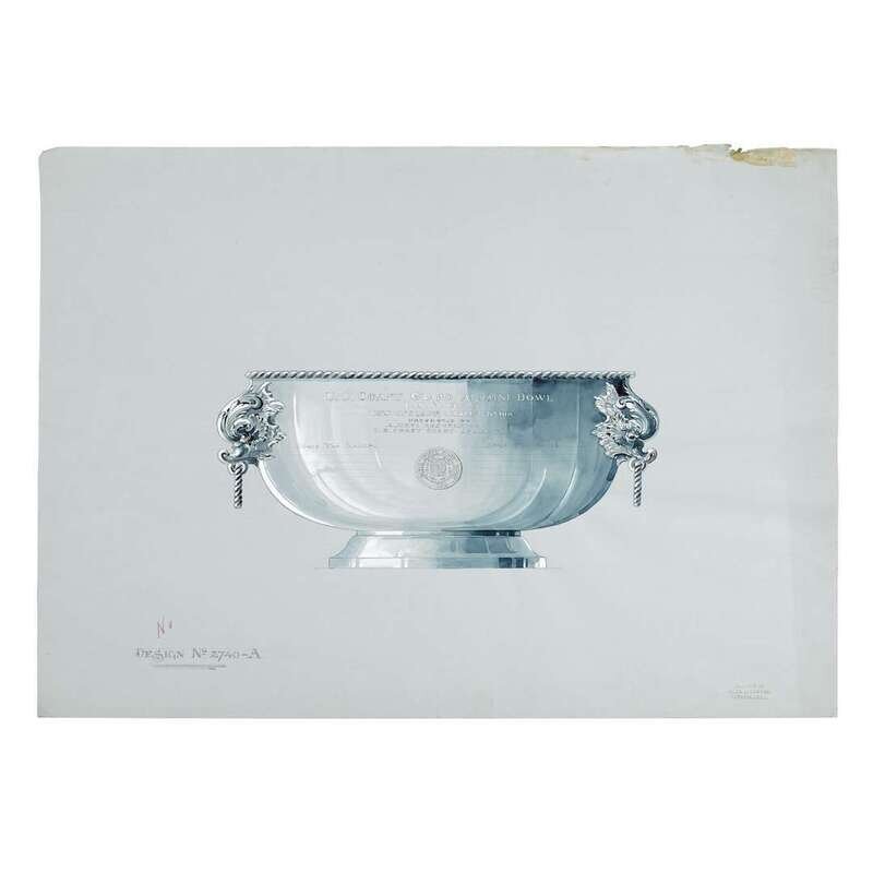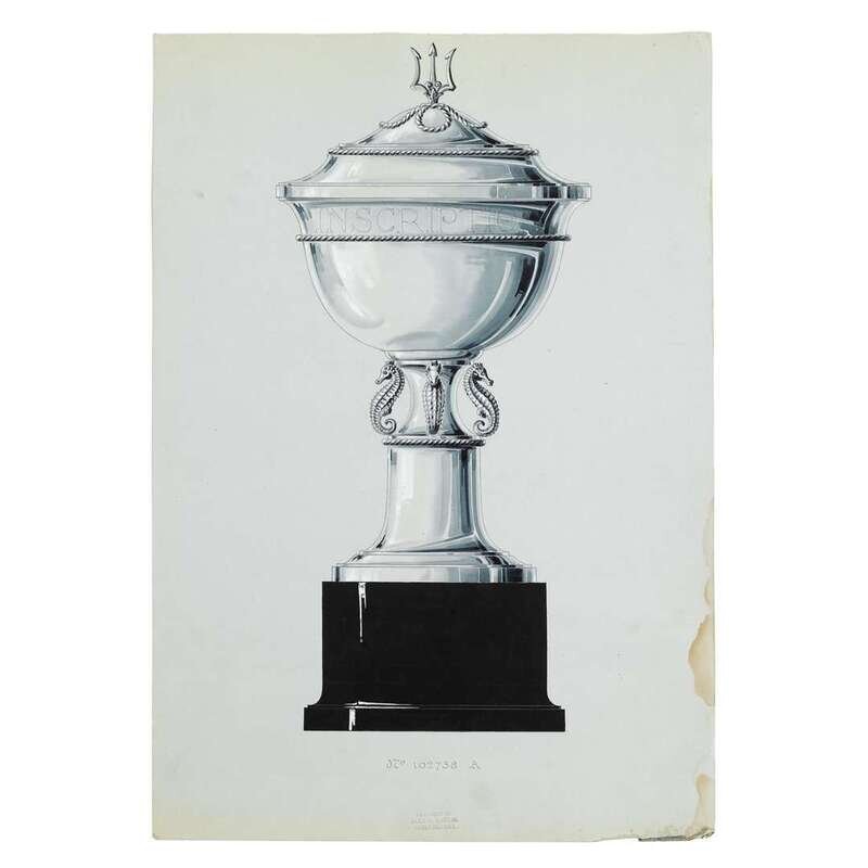 Including Design No. 2740-A for the U.S. Coast Guard Alumni Bowl I.C.Y.R.A. New England Championship Presented by Alumni Association U.S. Coast Guard Academy; set of three nautical trophies: No. 102738 A, B, & C; a presentation cup presented to Winner Frank W. Roche by the WHQ, Summer Meeting, 1938; and Design No. 32548C for the Junior Amateur Championship United States Golf Association Instituted 1948; all graphite, heightened with gouache, on blue paper; the last, framed.