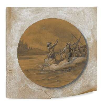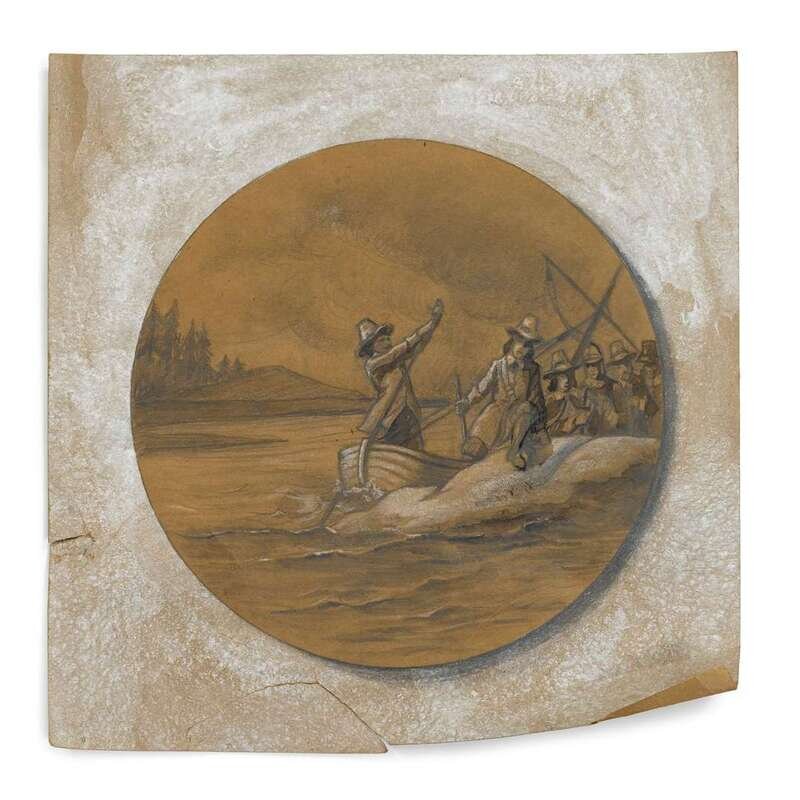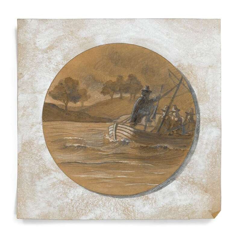 The obverse depicting the Mayflower with inscription, "The Mayflower in Whose Cabin was Signed the Compact in Cape Cod Harbor 21 Nov 1620"; the reverse with pilgrims centering inscription, "1620-1970 Landing of the Pilgrims at Plymouth 21 December 1620," both affixed to wood board above plaque inscribed, "To commemorate the Landing of the Pilgrims, 350 years ago, the National Association of Congregational Christian Churches commissioned Reed and Barton Silversmiths of Taunton, Massachusetts to produce a limited number of medallions in Sterling Silver and Britannia metal"; together with two related, orginal Reed & Barton sketches.