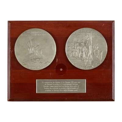 Metal models of the obverse and reverse of the medallion commemorating the 350th Anniversary of the Landing of the Pilgrims at Plymouth sculptor: g.l. turner for reed & barton, taunton, ma, 1970