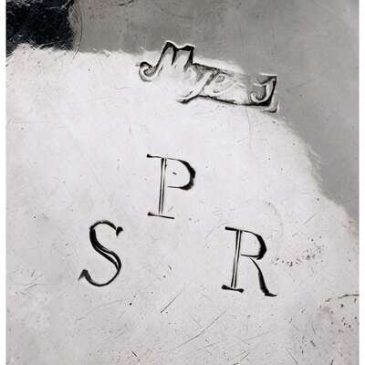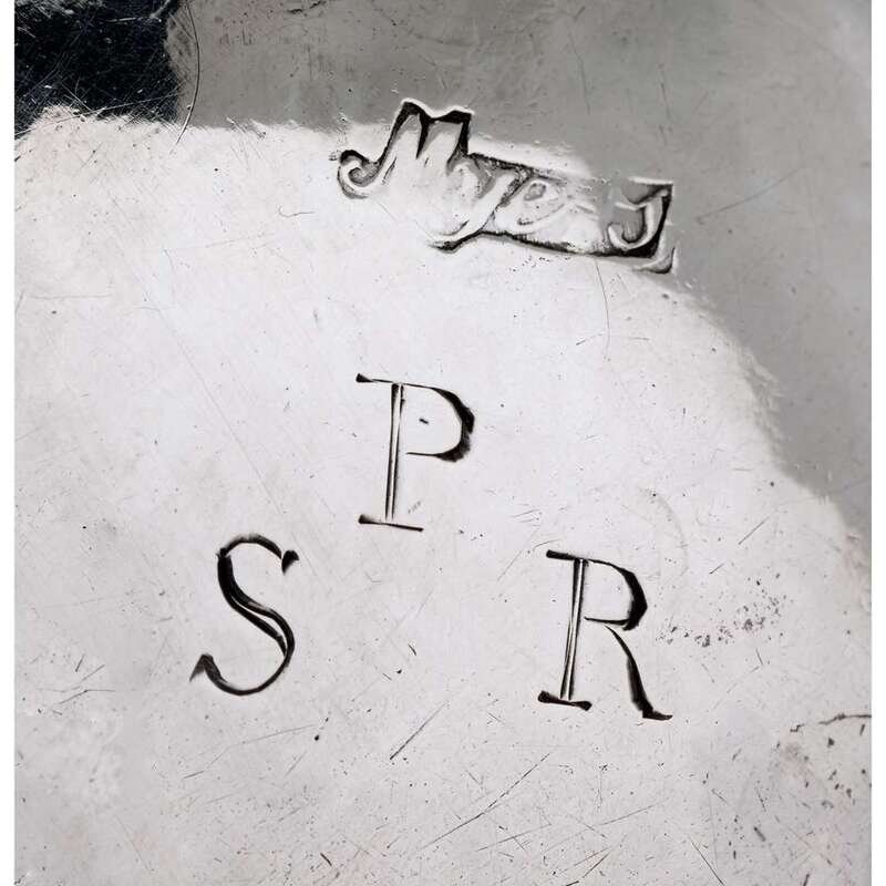 Raised on three hoof feet headed by scrolls, the underside with maker's mark and engraved initals, "SPR."