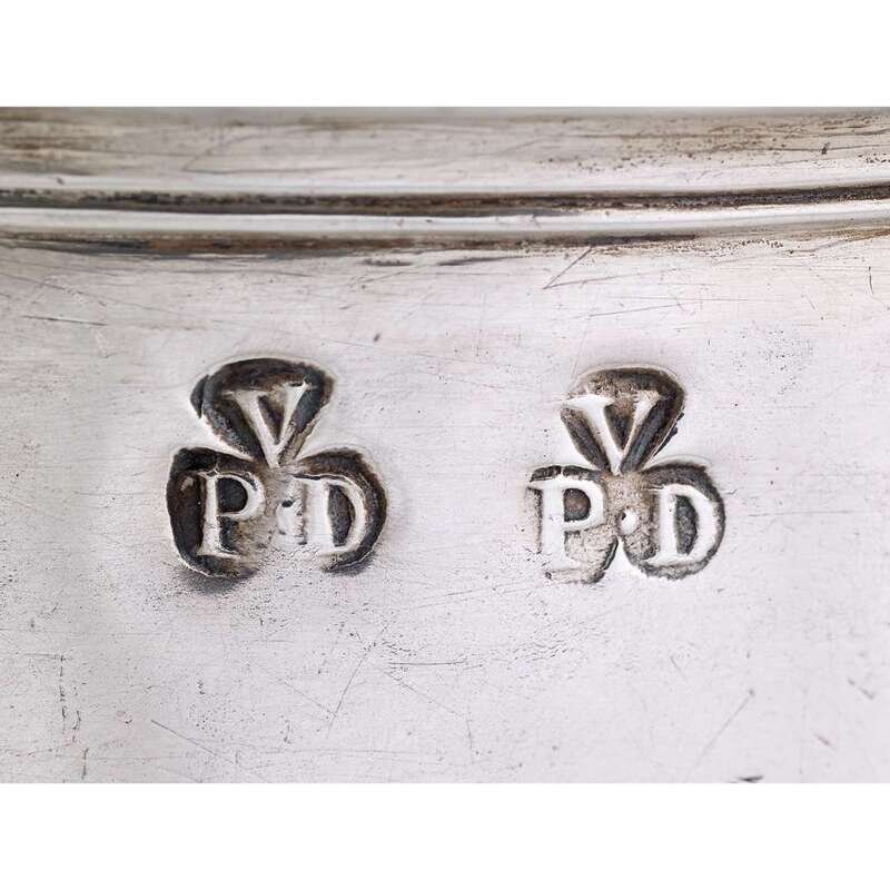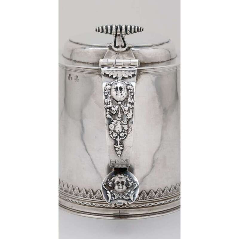 The lid with scrolled thumbpiece and engraved, serrated front edge, the foot applied with crimped wire below leaf, cut-card border, the scroll handle with applied maskhead and swags above engraved initials, "H*M," the lower terminal with cast cherub's head, marked twice to shoulder.