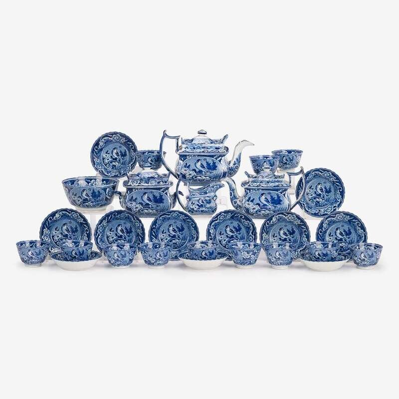 Staffordshire blue transferware "Bird's Nest" teawares first half 19th century