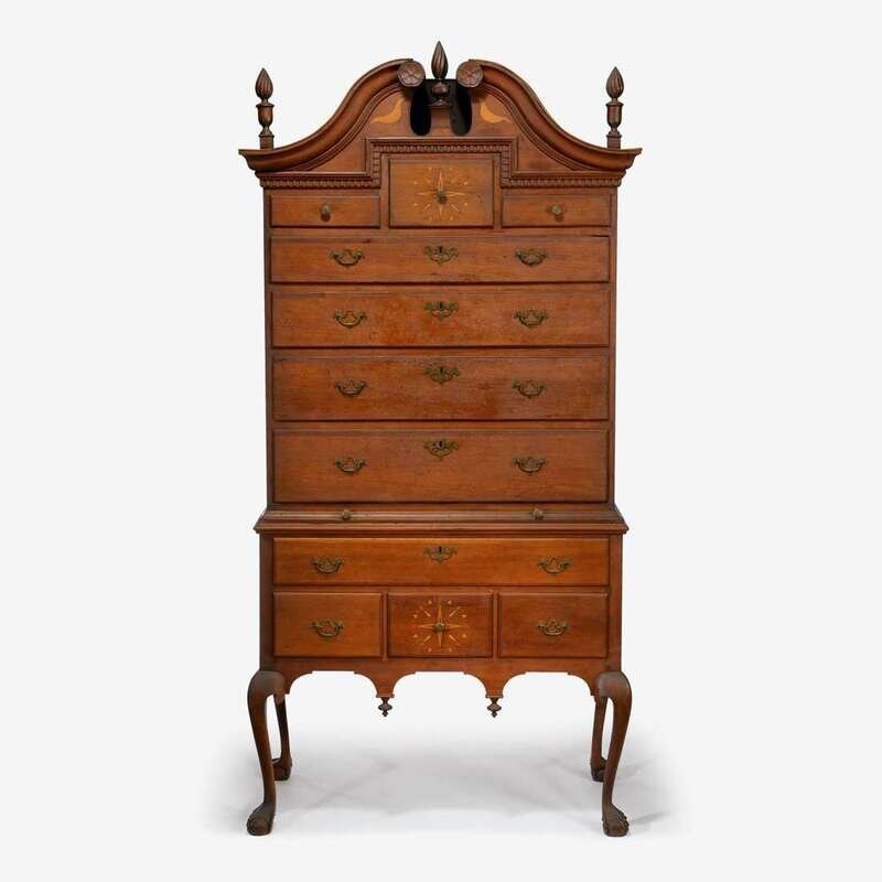 Chippendale cherrywood inlaid bonnet top high chest connecticut, late 18th century top on later base