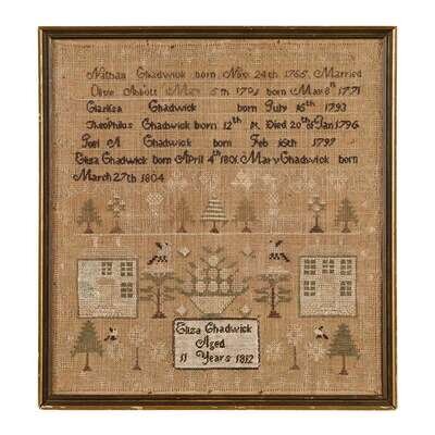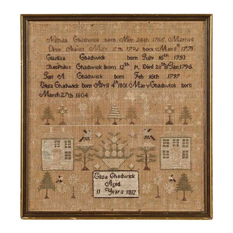 Needlework sampler: Family Register of the Chadwick Family of Worcester, Massachusetts "eliza chadwick aged 11 years 1812"