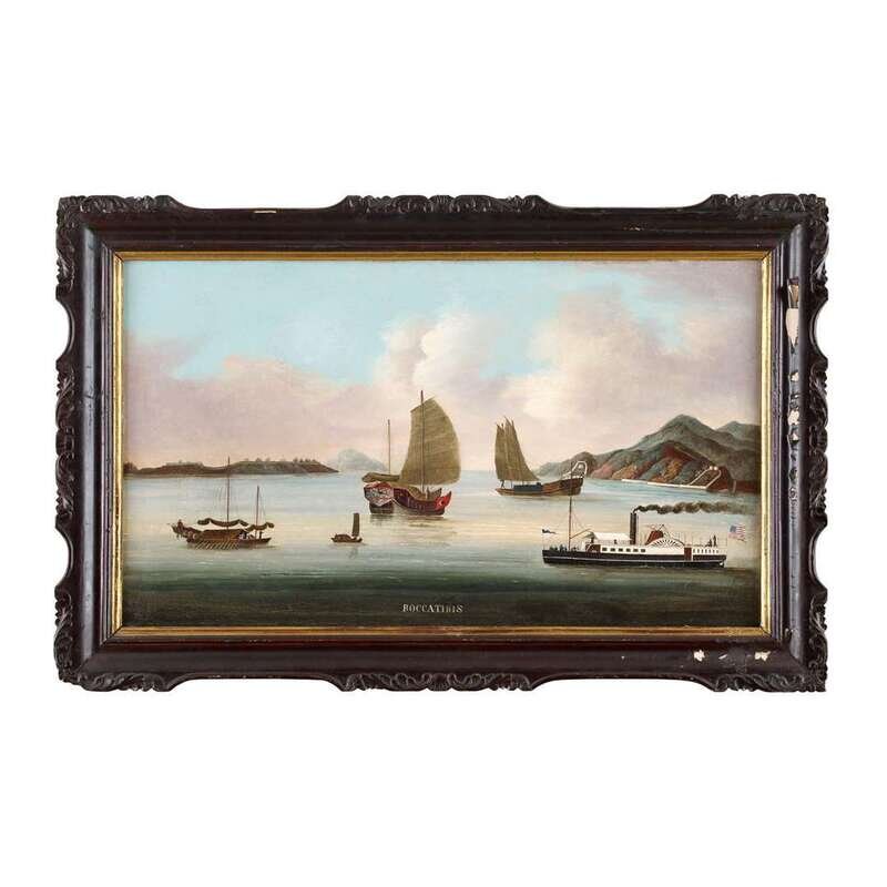 China Trade Painting 19th century view of the port of bocca tigris with american steamship