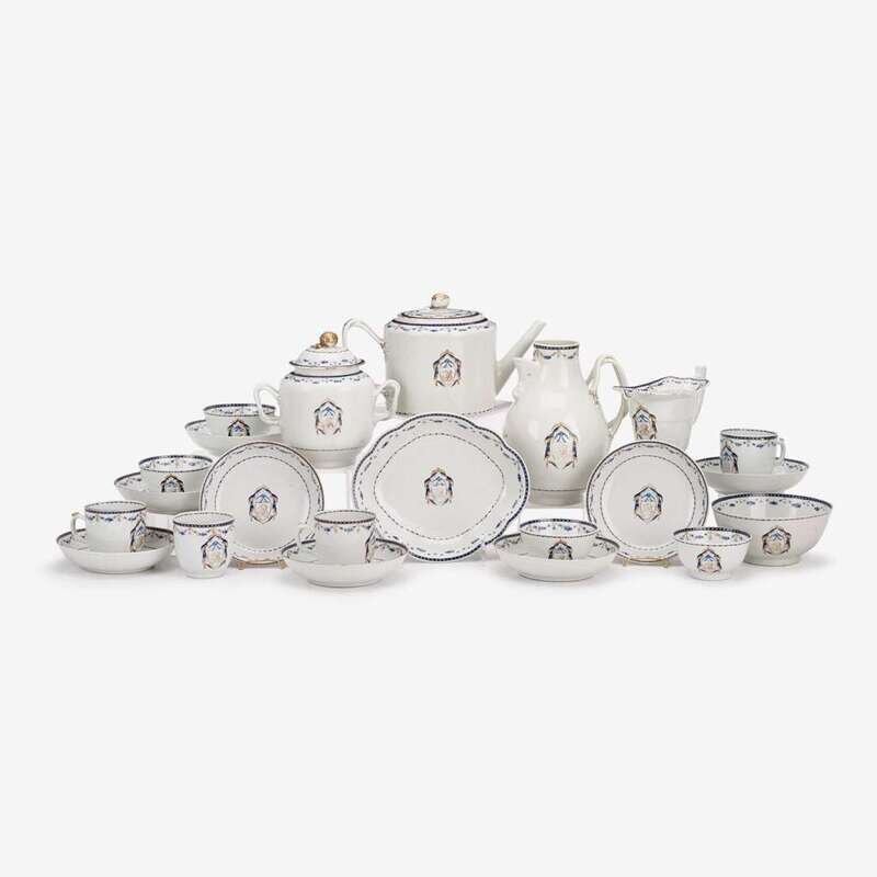 Chinese Export porcelain Armorial blue and gilt partial tea service for the American market, possibly for the Bettle Family of Philadelphia 19th century