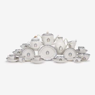 Comprising a drum-form teapot, covered sugar bowl, helmut-form creamer, water jug, waste bowl, scalloped dish, four teabowls, four teacups, and eight saucers, each with a mantled shield enclosing the gilt initial, "B."