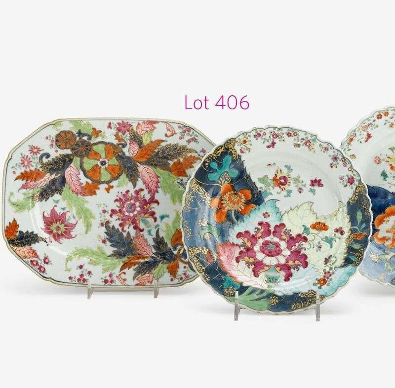 Fine Chinese Export porcelain Famille Rose 'Pseudo Tobacco Leaf' pattern octagonal platter and a scalloped 'Tobacco Leaf' pattern plate 1765-1775