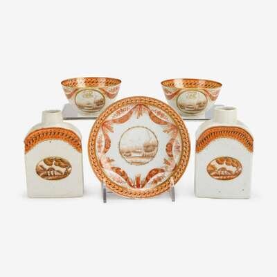 Decorated with red, orange and gilt, swagged banding and central, sepia vignette depicting building in landscape, the cups with gilt initial, "H"; together with a pair of tea caddies made for the American market with conforming orange and gilt banding and sepia vignette depicting house in landscape, and an associated saucer.
