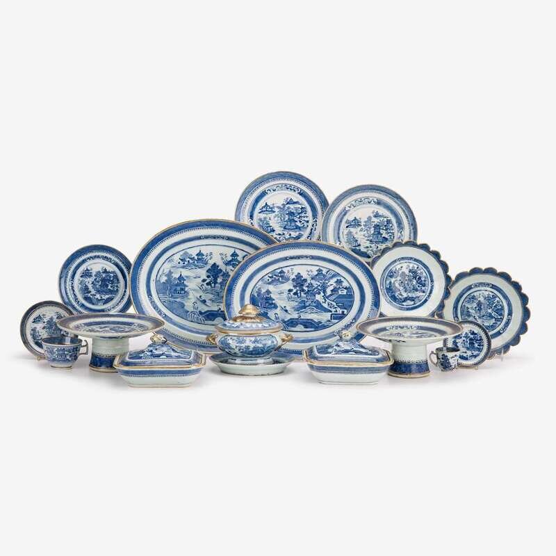 Comprising two large oval platters, two tazzas, two scalloped bowls, two covered, rectangular vegetable dishes, one open, rectangular vegetable dish, one small, twin-handled oval tureen with underplate, eight large plates, eleven small plates, five coffee cups, eight teacups, twenty large saucers, and twelve small saucers; together with a blue 'Fitzhugh' teapot, a 'Nanking' covered sugar bowl and a 'Canton' creamer.