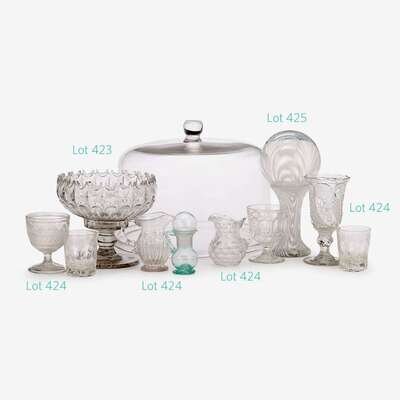 Including a green creamer with witch ball (probably southern New Jersey, circa 1840), a mold-blown colorless creamer, a brilliant-cut creamer, a "Comet" pattern celery vase (probably Boston & Sandwich, circa 1830), a pair of "Last Drop" tumblers engraved with hanged men, and two pattern-molded open compotes.