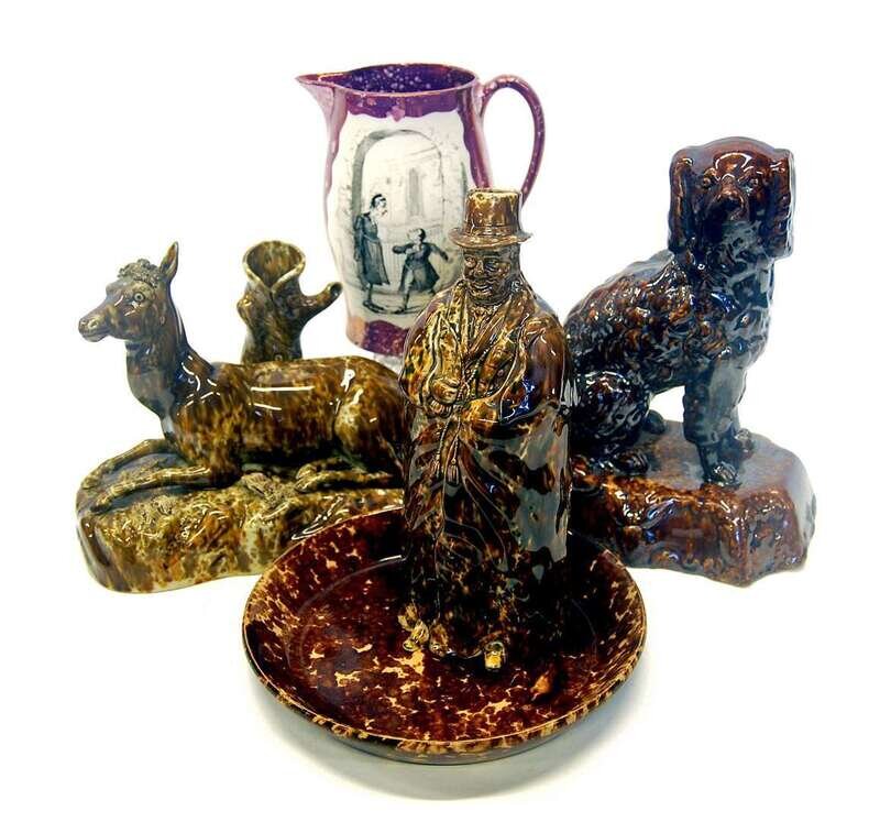 Including a Coachman bottle, bearing 1849, mark and a recumbent stag on rustic oblong plinth, both flint-enameled; together with a seated Spaniel, pie dish and a Staffordshire transfer-decorated lustreware jug.