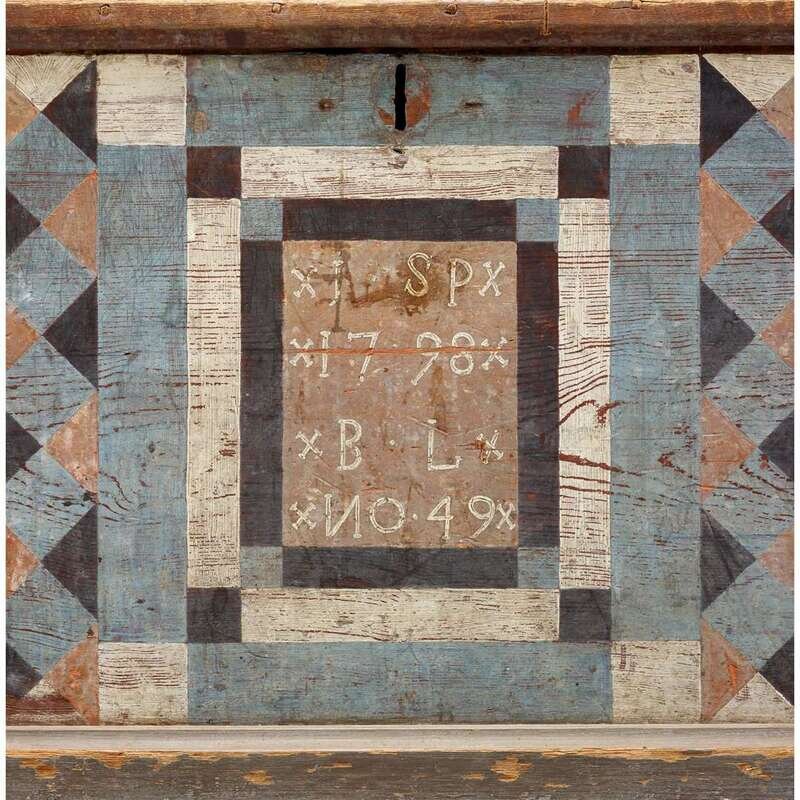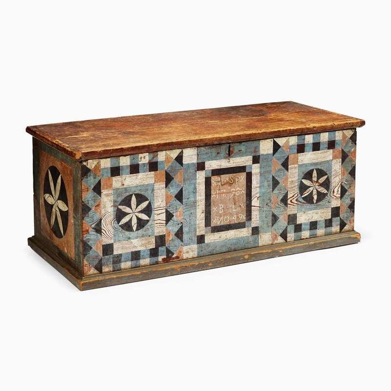 Paint-decorated yellow pine blanket chest johannes spitler (1774–1837), massanutten, page county, va, dated "179