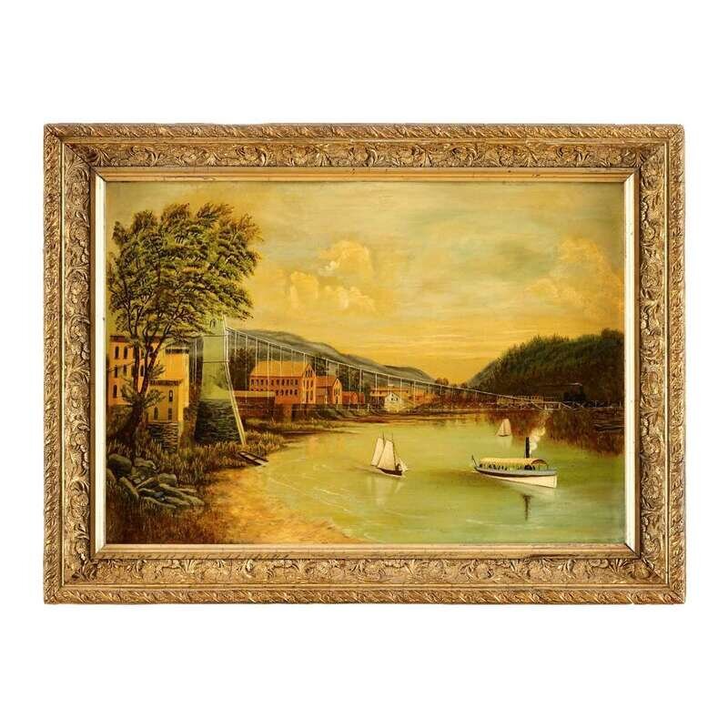 American School 19th century new york waterway with suspension bridge