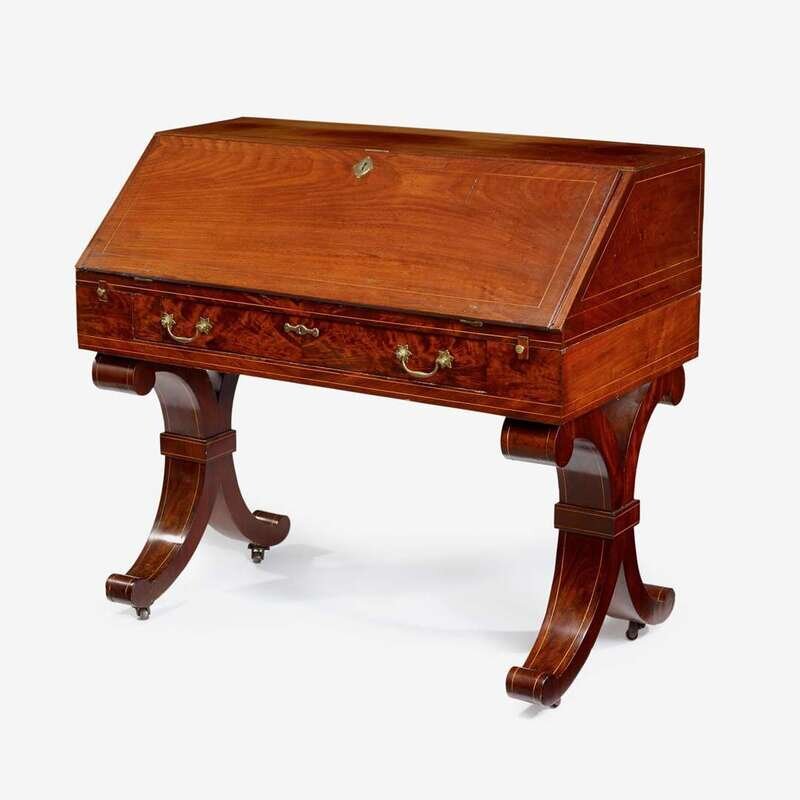 Classical inlaid mahogany slant-front desk on scolled base circa 1830