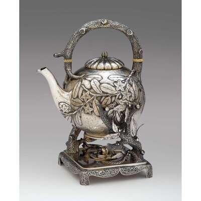Fine hand-hammered sterling silver 'Japanesque' hot water kettle on stand gorham mfg. co., providence, ri, with date letter for 1881
