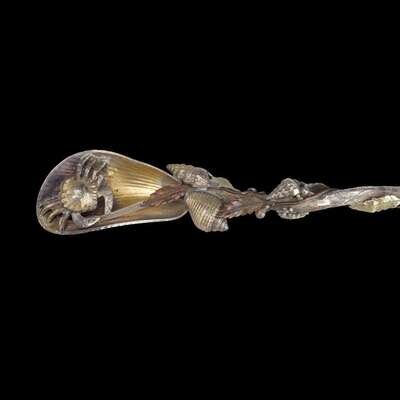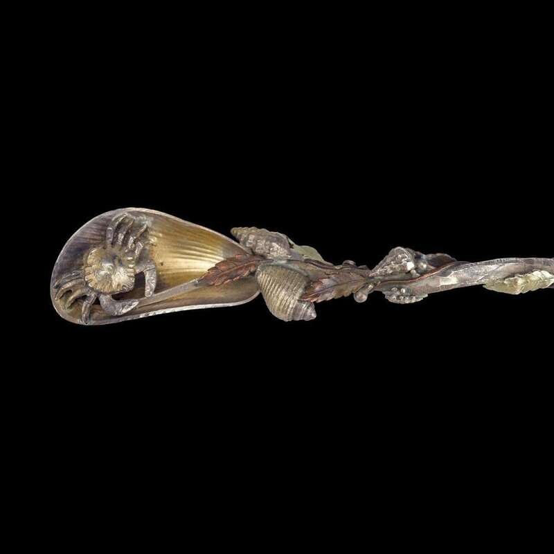 Each of a unique design, the handles applied with underwater plant and animal life forms, including seaweed, conch shells, fish, crabs, and barnacles, each terminating in a shell, some with sand particles, each marked to back of stem with maker's mark and stamped "Sterling," three additionally marked "& Other Metals."