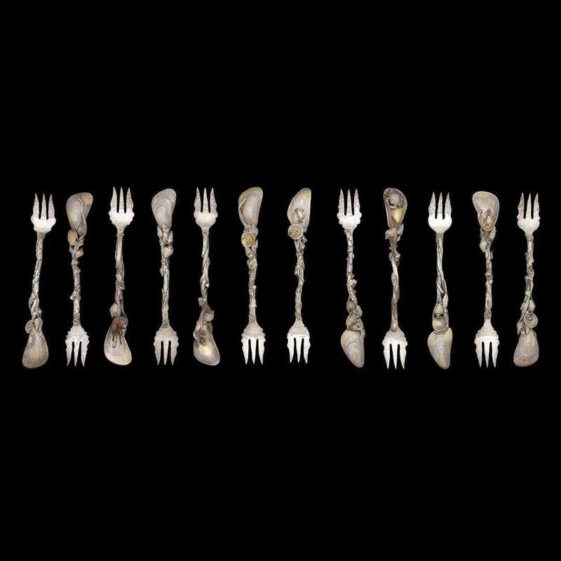 Extremely rare set of twelve sterling silver and mixed metal 'Narragansett' pattern oyster forks gorham mfg. co., providence, ri, introduced 1884