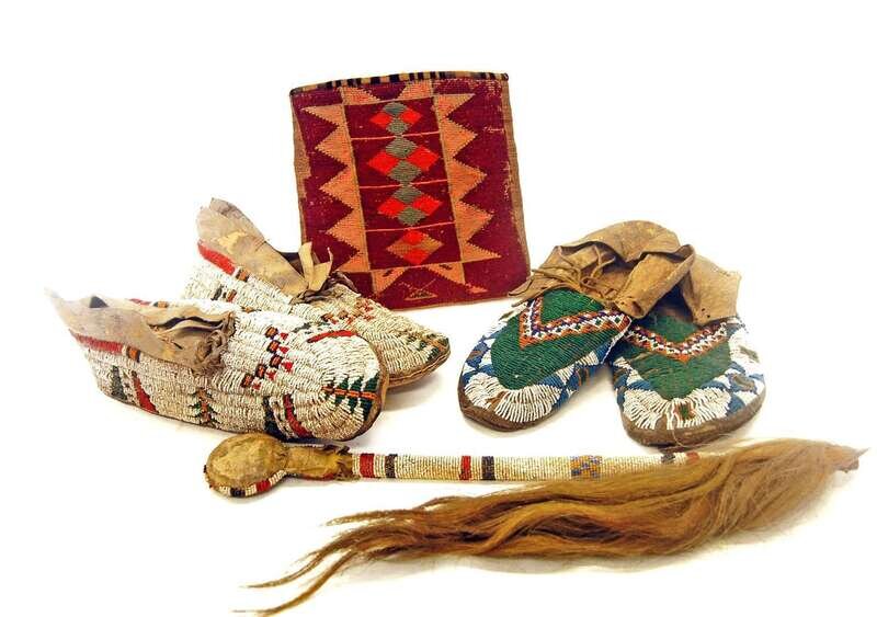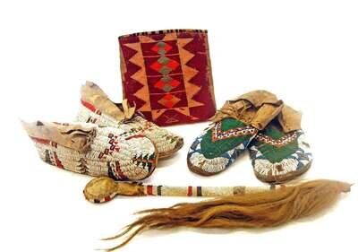Including an Apache sling-shot skull crusher with beaded handle and horse hair end, a pair of Lakota beaded moccasins, a pair of Plains beaded moccasins, and a Nez Perce woven hemp, cornhusk and embroidered wool bag, and a Central or South American squat pottery jar.