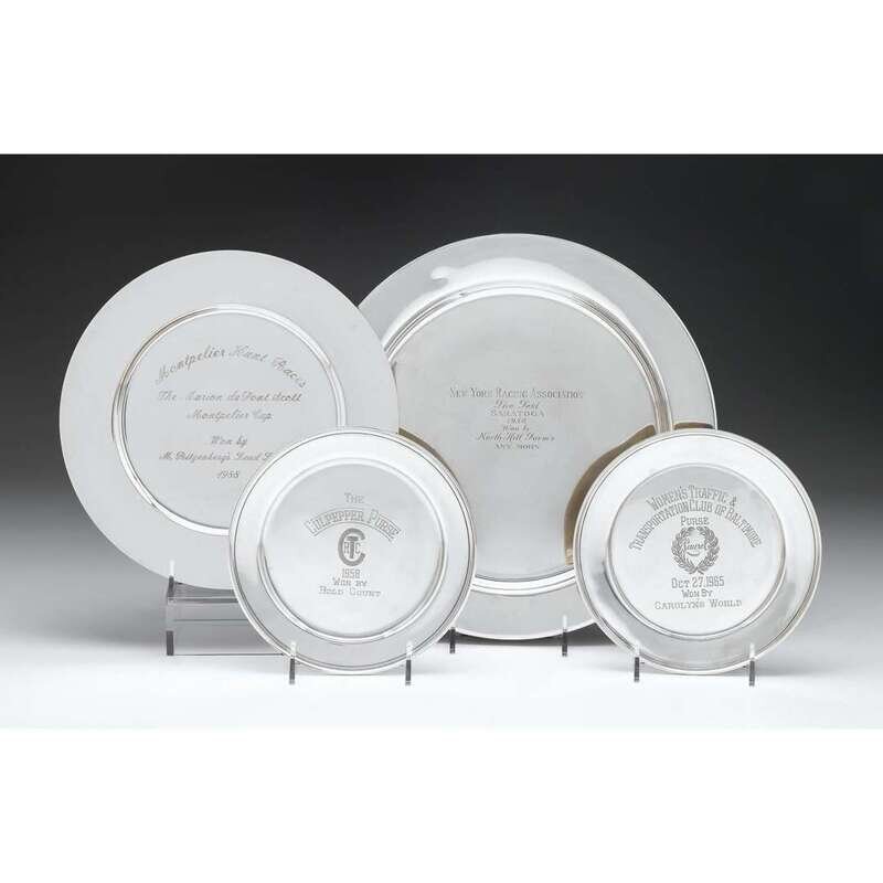 The first by Cartier engraved 'New York Racing Association The Test Saratoga 1958 won by North Hill Farm's Any Morn'; the second by Boardman Sterling engraved 'Montpelier Hunt Races The Marion duPont Scroll Montpelier cup Won by M. Ritzenberg's Loud Landing 1988'; the third by Baltimore Silversmiths Mfg. Co., engraved 'The Culpepper Purse 1958 won by Bold Count'; the last by Schofield engraved 'Woman's Traffic and Transportation Club of Baltimore Purse Laurel Oct 27, 1965 won by Carolyn's World.'