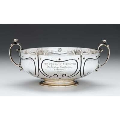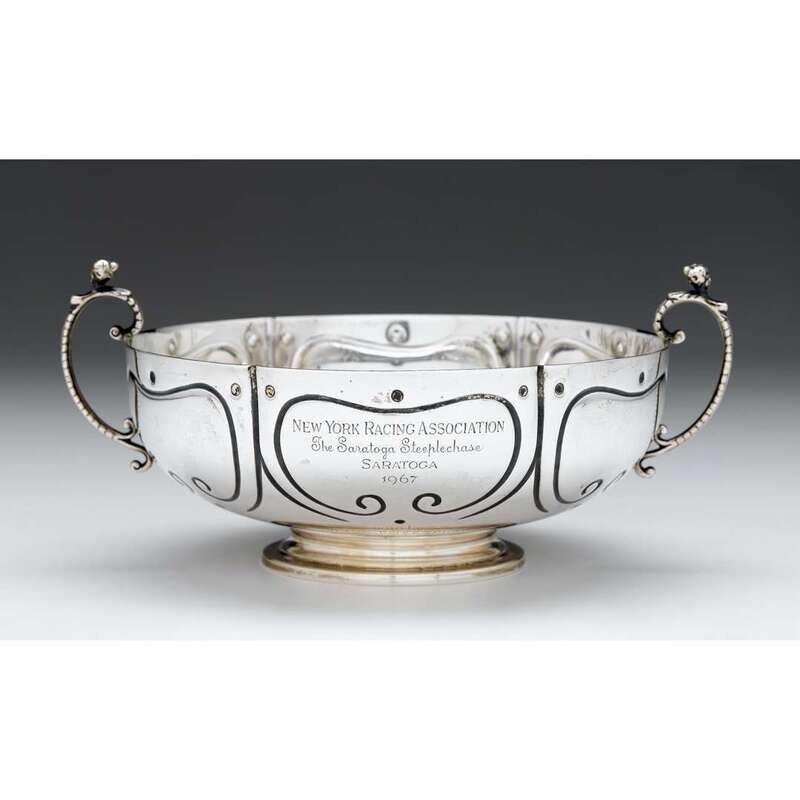 Circular with twin maiden-form handles, engraved 'New York Racing Association The Saratoga Steeplechase Saratoga 1967 won by Milton Ritzenberg's Spooky Joe', the underside marked 'Simeon Soumain reproduction circa 1720'