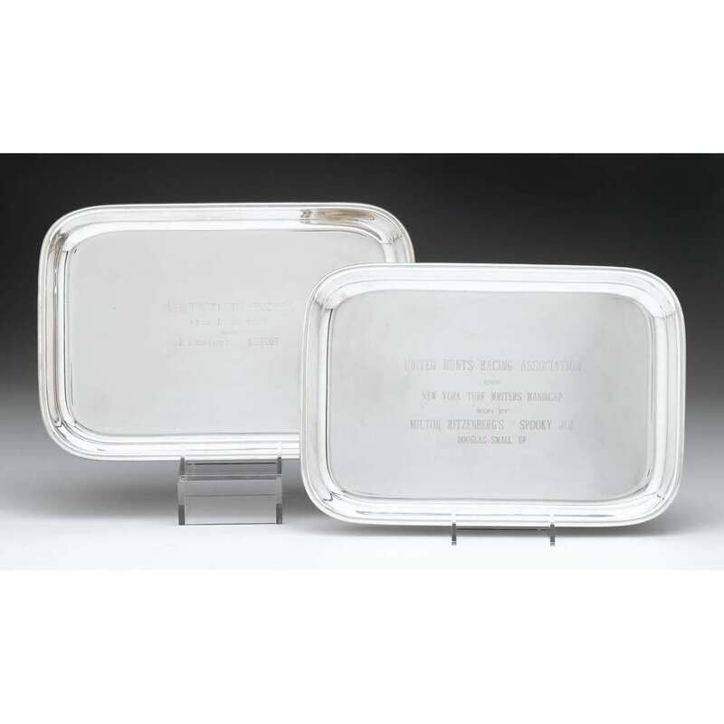 The first engraved 'United Hunts Racing Association hurdle division award 1963 M. Ritzenberg's Mieldor'; the second engraved 'United Hunts Racing Association 1966 New York Turf Writers Handicap won by Milton Ritzenberg's Spooky Joe Douglas Small up.', rounded rectangular form