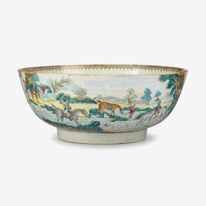 RARE CHINESE EXPORT PORCELAIN FAMILLE ROSE 'HUNTING' PUNCH BOWL C. 1775