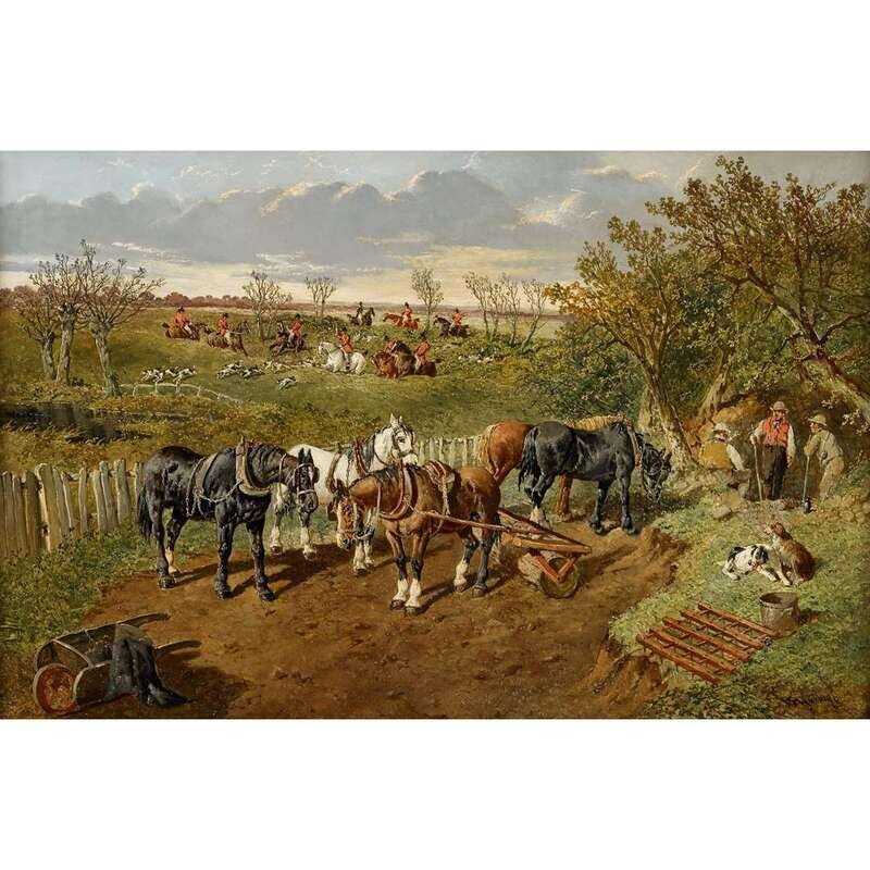 JOHN FREDERICK HERRING, JR. (BRITISH 1815-1907) FOUR CARTHORSES WITH FOX HUNT BEYOND
